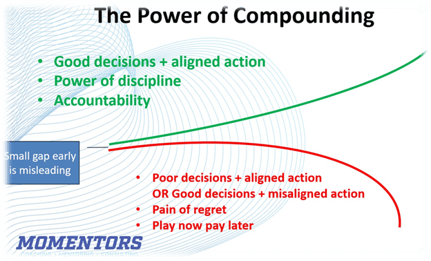 Every single day, you’re either on the green line (slight edge up) or the red line (slight edge down). See Jeff Olson’s book the Slight Edge for more depth here. And the gap between them? That’s the decisions you make and the actions you take.