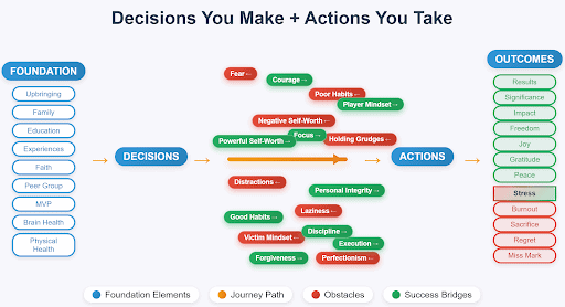 Once we make the DECISION, the messiness in the middle determines whether or not we take the appropriate ACTIONS. That which is in red holds us back, that which is in green propels us forward. This is where the bulk of coaching and accountability happens – improving the foundation, making better decisions with more clarity, and clearing the hurdles to take action. The OUTCOMES follow.